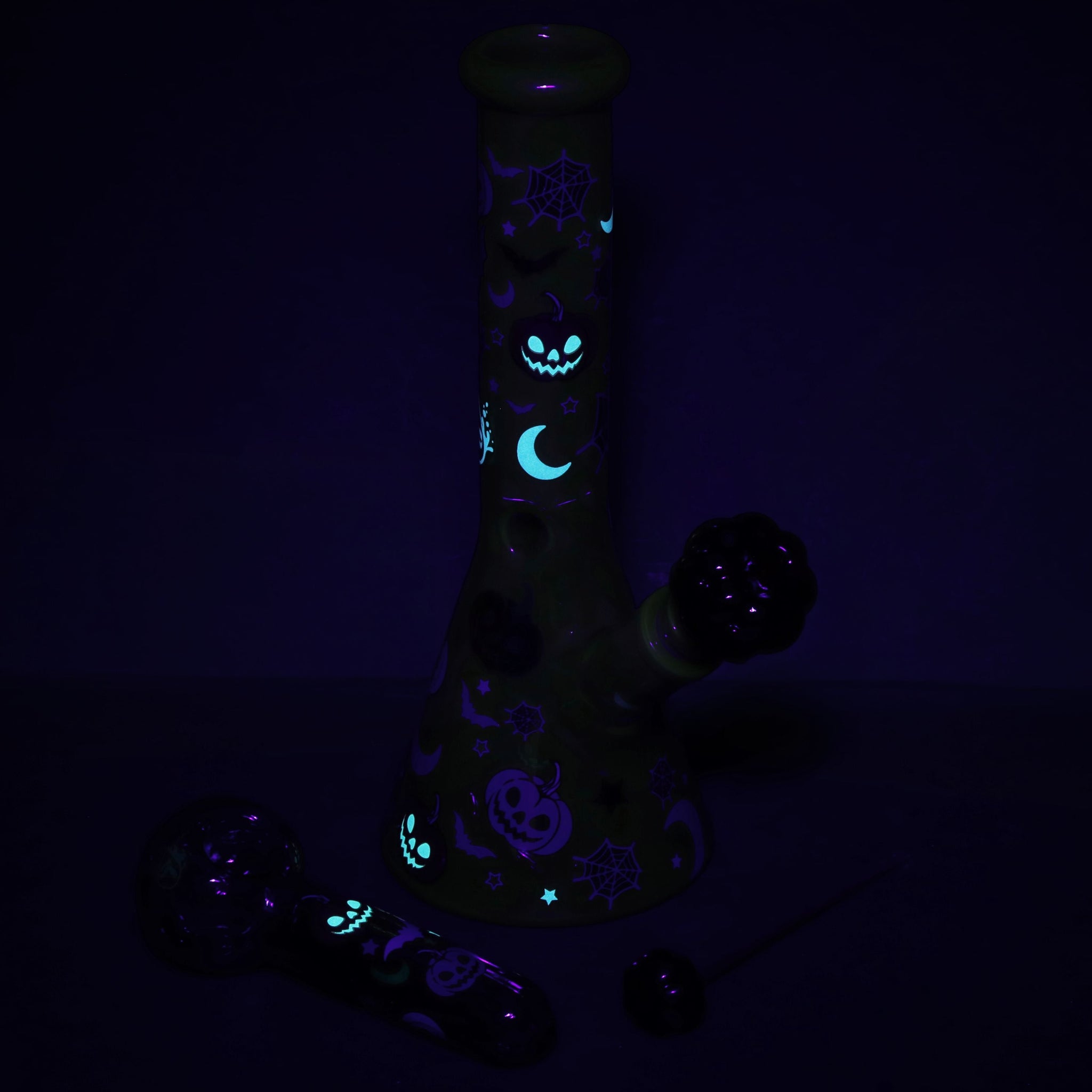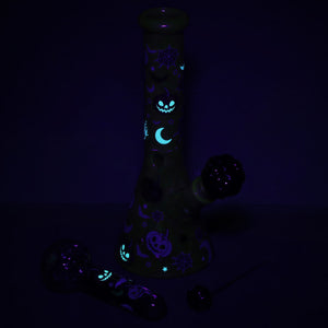 Get spooky with your smoke sessions thanks to theHalloween Party Glass Duo — a matching set that glows in the dark and brings festive vibes all October long (or year-round if you're about that life). This limited edition set includes a10-inch beaker-style bong with a 3-pinch ice catcher for cool, smooth hits and a5.25-inch spoon-style hand pipe perfect for on-the-go toking. Both pieces are decked out in playful Halloween designs and finished with glow-in-the-dark accents that come alive under dim light. You’ll also get a matchingmetal poker tool with a glass topper, so you’re always ready to clear your bowl in style.