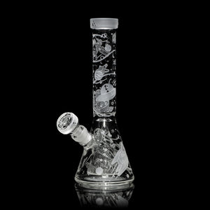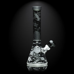 The Space Odyssey 3D Beaker Bong elevates Milky Way Glass’s signature design into a fully immersive visual experience. Standing 11 inches tall, this unique beaker bong features detailed sandblasted artwork throughout, including the Collins percolator.